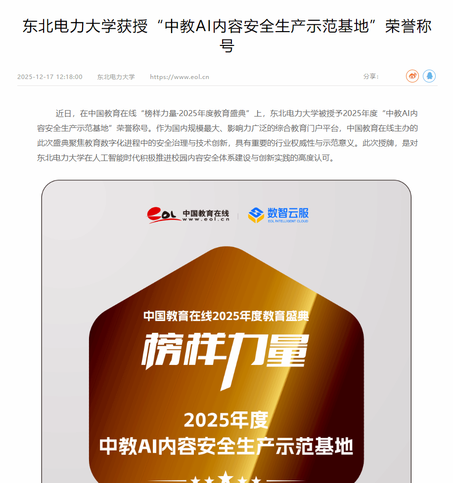 中国教育在线:东北电力大学获授“中教AI内容安全生产示范基地”荣誉称号